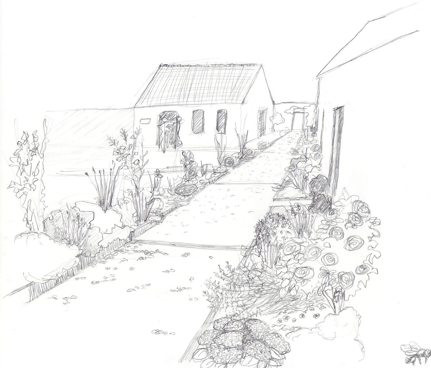 En son centre, une cour fermée, lieu de passage et d’échanges, relie la maison principale, la grange, la maison d’été et la future serre. Le jardin y trouve son ancrage, entre ombre et lumière, entre intérieur et extérieur. Madame B., jardinière passionnée et amoureuse des plantes, fait appel à l’Atelier des Mille Temps pour l’accompagner dans la création d’un jardin à la fois rêveur et fonctionnel. Ensemble, nous avons esquissé une toile vivante, appelée à se déployer au fil des saisons.