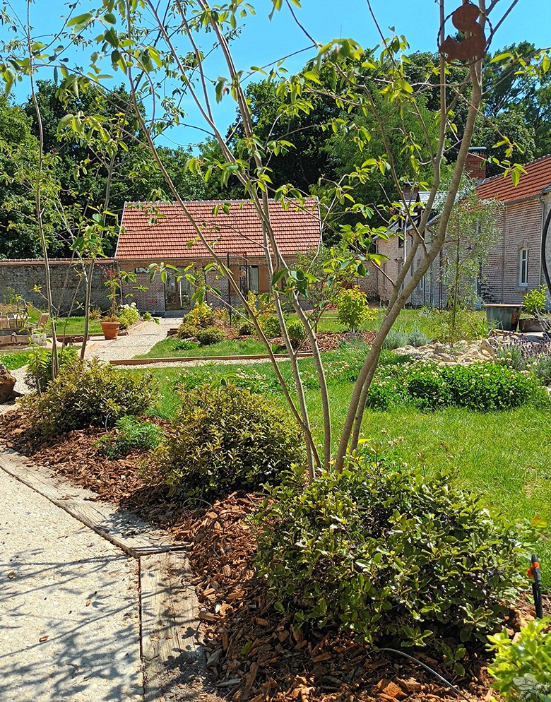 En mars 2025, une première étape majeure a vu le jour. Une partie des végétaux a été plantée sur la moitié du jardin, les pelouses et la prairie fleurie ont été semées, et les cinq arches en métal se dressent désormais fièrement, dessinant les perspectives et les passages. Le résultat visuel est immédiat : le jardin existe déjà, il habite l’espace et révèle ses lignes. On devine les volumes à venir, les masses végétales qui s’installeront et les jeux d’ombre qui se dessineront. Il ne reste plus qu’à poursuivre les plantations et laisser ce bel endroit s’étoffer, grandir et s’enraciner au rythme des saisons.