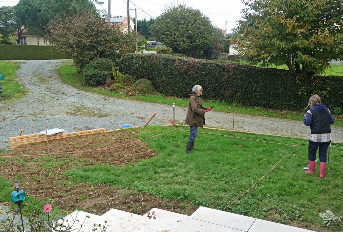 Ensemble, avec la cliente, nous avons procédé à l’implantation du massif, reportant le dessin au sol pour en marquer les contours et définir les zones à modeler.
